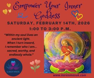 ❤ Wow Karen… this workshop was exactly what I needed. Thank you for lovingly holding sacred space as you allowed me to connect to my creative expression while bulldozing through blockages, old patterns and traumatic memories from this life and past lives. It brought up alot of tears and many emotions that I did not want to previously acknowledge, but now I have an amazing sense of purpose with so much clarity and em-POWER-ment. ~